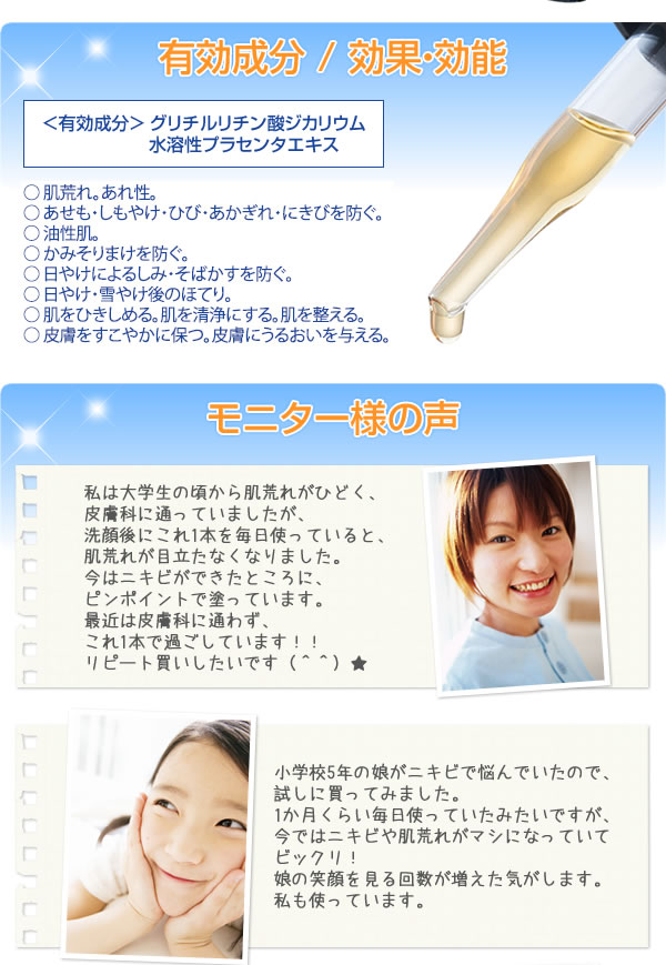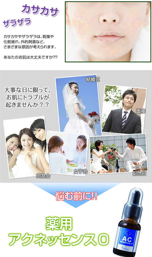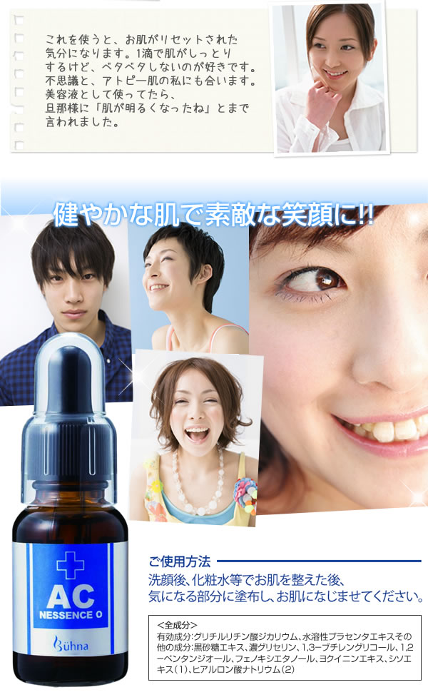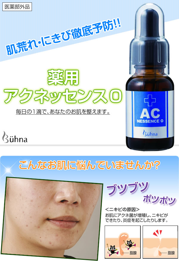 ニキビ、肌荒れ、あせも、しもやけ、あかぎれ・・・。こんなお肌になる前に!ビューナ薬用アクネッセンスOは、有効成分グリチルリチン酸ジカリウムと水溶性プラセンタエキスであなたのお肌をケアします。