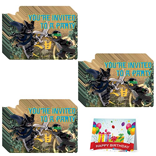 -. Binding : Toy -. Brand : Lego Ninjago Party Supplies -. EAN : 0720780768876 -. Feature : 24 Lego Ninjago Invitations / 1 Happy Birthday Card / Now that your little ones are done saving Ninjago, Invite your child's friends to help save Ninjago with The Lego Ninjago Movie invitations. / Recruit their friends to fight evil with these ninja birthday invitations that feature Lloyd Garmando. -. IsAdultProduct : 0 -. Label : Lego Ninjago Party Supplies -. Manufacturer : Lego Ninjago Party Supplies -. ProductGroup : Toy -. ProductTypeName : TOYS_AND_GAMES -. Publisher : Lego Ninjago Party Supplies -. Studio : Lego Ninjago Party Supplies -. Title : The Lego Ninjago Movie Deluxe Party Invitations Bundle -. UPC : 720780768876