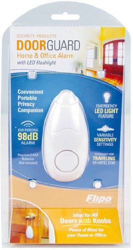 Studio : Flipo Publisher : Flipo Binding : Sports Product Description the Door Guard Alarm is a very versatile vibration alarm. Ideal for home, office, or travel. this alarm requires no installation, simply hang it on any doorknob and it instantly detects any vibration. When the alarm is tripped, it will emit a 98 dB alarm for 20-30 seconds, then will reset in 3-5 seconds. The sensitivity of the alarm is easily adjusted with a screwdriver. the Door Guard can also be used as a flashlight. The Door Guard is ideal for keeping you and your loved ones safe from harm whether in your home or while you travel. Not sure about that shady looking hotel, but can't beat the price? Now you can feel confident and safe. Uses 2 AAA batteries (not included). 0