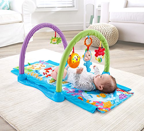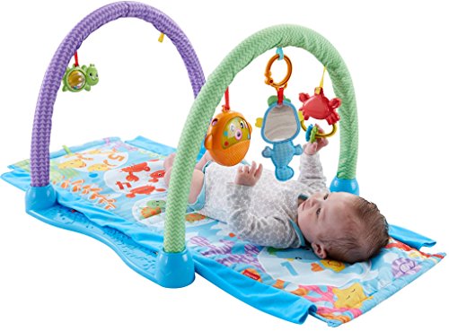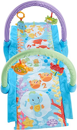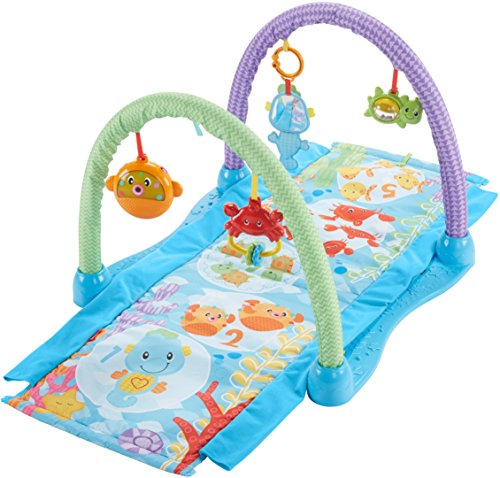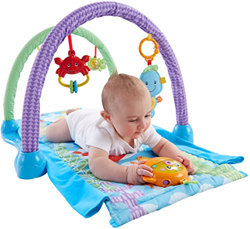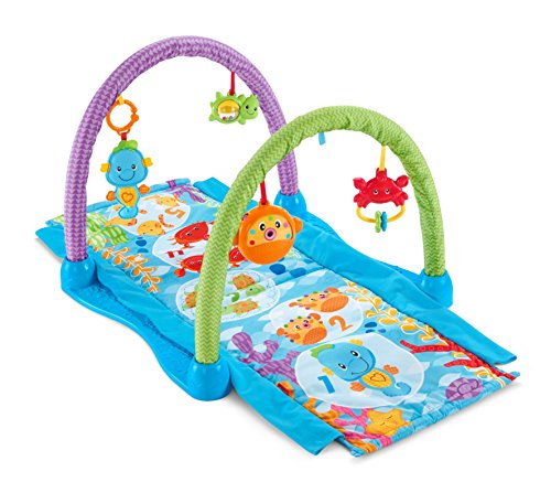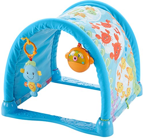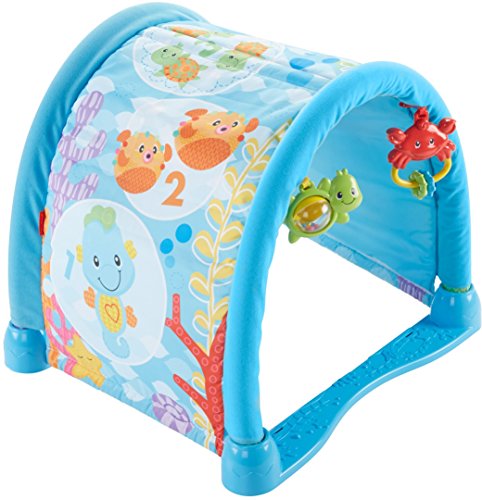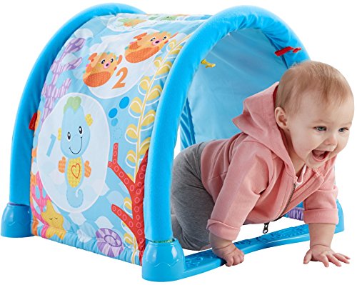 -. Feature : 2 ways to play Mat transforms as baby grows: 1. Lay & play and tummy time discovery with overhead activity arches. 2. Crawl-through tunnel / Motion-activated blowfish plays music and lights up as baby moves / Attachable, overhead sea-creature toys, including a seahorse mirror, turtle rattle and crab clacker, keep baby entertained while boosting gross and fine motor skills / Machine-washable padded mat has colorful graphics and numbers to introduce counting / Give baby's gross motor skills a workout as they lay and play