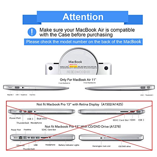 -. Feature : The case only fits for Macbook Air 11 inch / Hard Plastic Case with Rubber paint over Top and Bottom Covers for Silky-smooth soft-touch. Protects your MacBook Air from scrapes and scratches. / Full access to all ports and plugs,Snap on design,easy on easy off. / Fully vented for safe heat disbursement,Built-in feet keep your notebook stable and secure / Anti-scratching,temperature resitance,clear opacity,sleek andtough enough to absorb external pressure