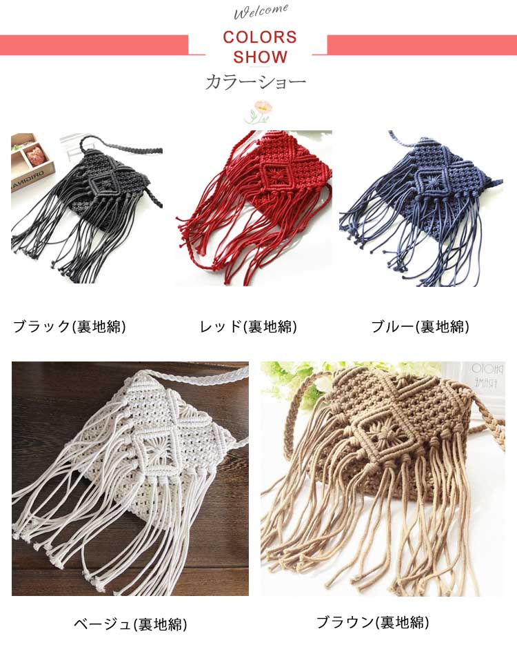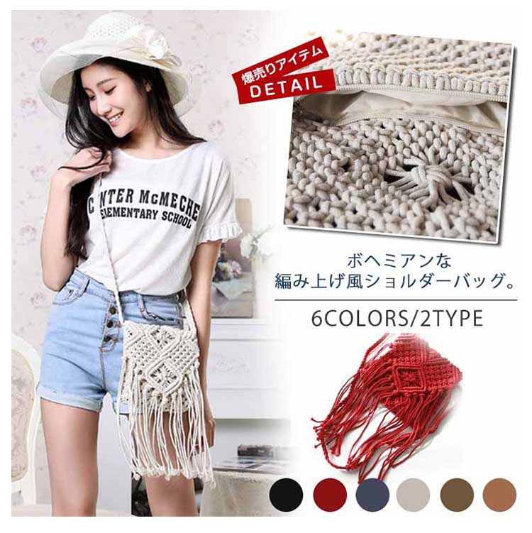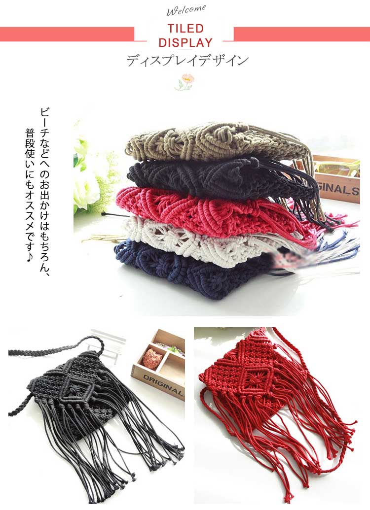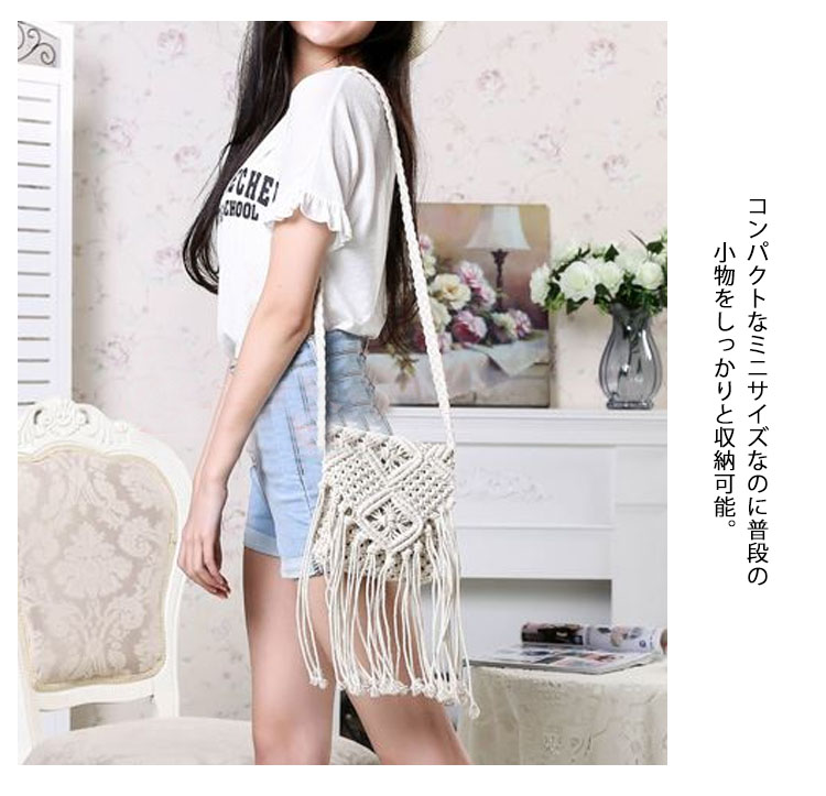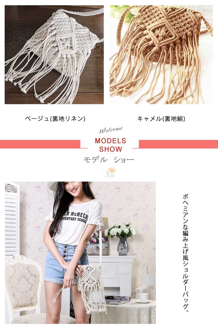 | ボヘミアンな編み上げ風ショルダーバッグ。長めのフリンジデザインが歩くたびに揺れて可愛いシルエットになります。コンパクトなミニサイズなのに普段の小物をしっかりと収納可能。ビーチなどへのお出かけはもちろん、普段使いにもオススメです♪ | |