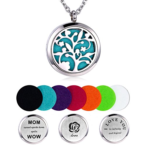Mother's Gift for Thanksgiving Aromatherapy Essential Oil Diffuser Necklace, Hypoallegenic Stainless Steel Tree of Life Locket with 23" Chain 7 Refill Pads and 3 Floating Charms for Mom