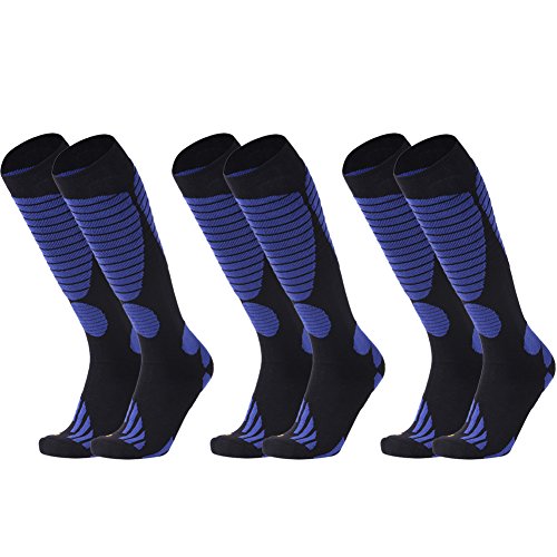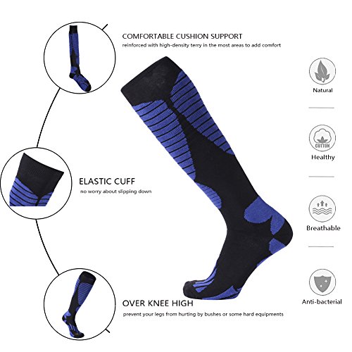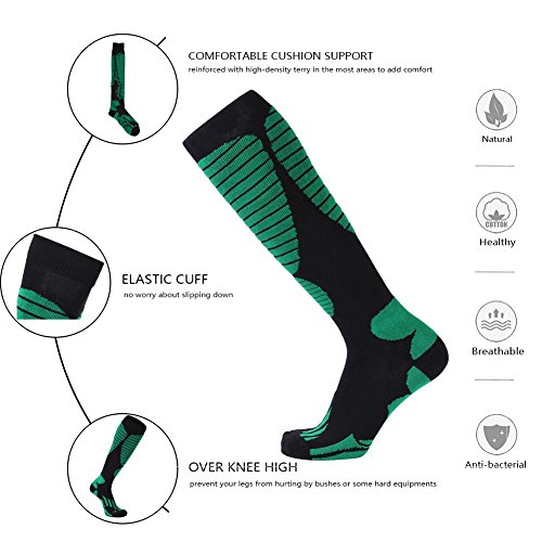 -. Feature : MOISTURE WICKING & ANTI-ODOR high-tech material consists of cotton and polyester wicks moisture away.Cotton helps to prevent bacteria reproduce in socks and ski boots to keep your feet health and inodorous.suitable for skiing,hiking,climbing,cycling,camping,walking,running and other cativities. / LIGHTWEIGHT AND WARM cotton and polyester are blended in a lightweight fabric to fit in all kinds of hiking,ski boots,while retain their advantages-warm and durable,and prevent painful blisters. / COMFORTABLE CUSHION SUPPORT Socks are reinforced with high-density terry in the most areas to add comfort when you take part in skiing,hiking,camping,walking,climbing and other outdoor activities.The socks work as a cushion between your feet and ski boots to comfort you. / OVER KNEE HIGH Socks are designed over knee high to prevent your legs from hurting by bushes or some hard equipments.It also keeps your legs warm in cold wind and snow when you enjoy skiing. / GUARANTEE - We think you're going to love this cotton skiing socks and hiking outdoor socks as much as we do. But in case you don't, just return it within 30 days for a full refund.We sincerely hope that you will be completely satisfied with our ski socks and service.