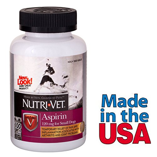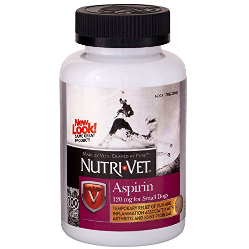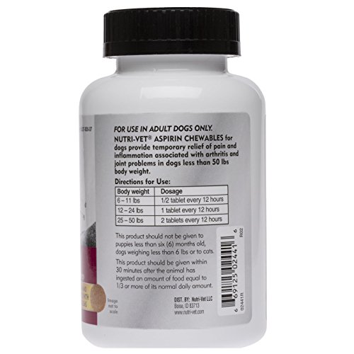 Aspirin liver flavor chewables provide temporary relief of pain and inflammation associated with arthritis and joint problems in dogs less than 50 lbs body weight. The liver flavor makes it easy to give and less upsetting to stomach. A highly palatable liver chewable tablet that contains 120 mg of buffered aspirin to aid in the temporary relief of pain and inflammation. This product should not be given to puppies less than six months old, dogs weighing less than 6 lbs or to cats. This product should be given within 30 minutes after the animal has ingested an amount of food equal to 1/3 or more of its normal daily amount. 6 - 11 LBS: 1/2 Tablet every 12 hours, 12 - 24 LBS: 1 Tablet every 12 hours, 25 - 50 LBS: 2 Tablets every 12 hours. Nutri-Vet offers a wide range of unique, veterinary formulated animal supplements and complementary external products that promote health and well being in pets. Sophisticated formulas combined with innovative delivery systems and high palatability profiles have positioned Nutri-Vet as the leading provider of natural animal products in North America. Each package comes with 1 unit Small Dog Aspirin 100 Chewable Tablets. Pictures may be magnified to show detail. For further information on size, color, conditions please refer to the item description or please ask a question before buying.Feature