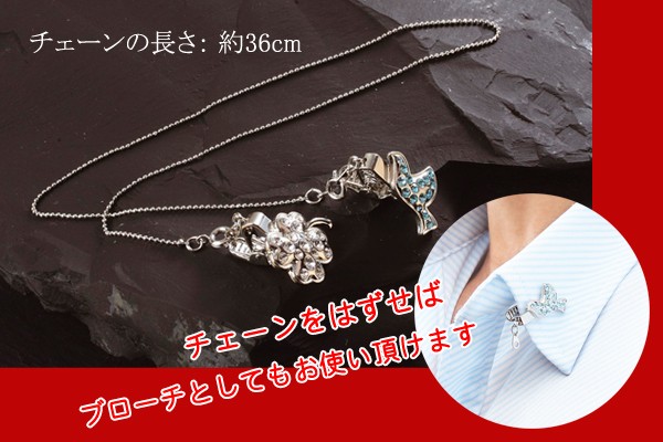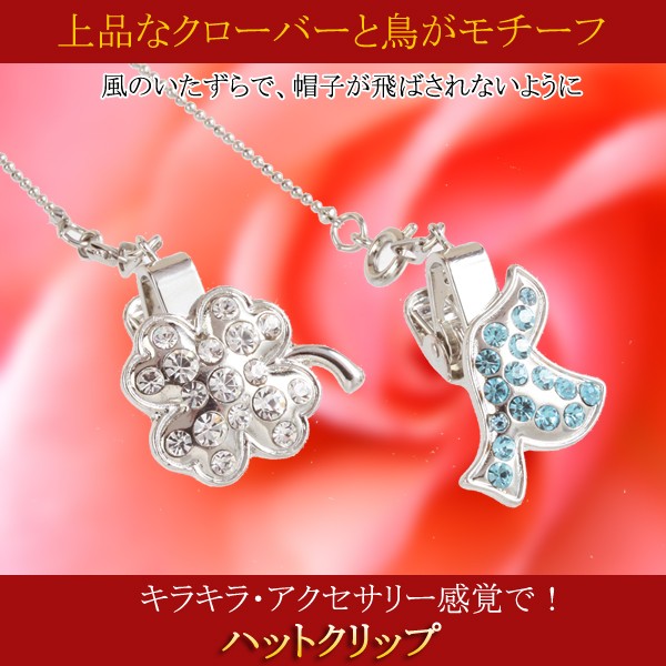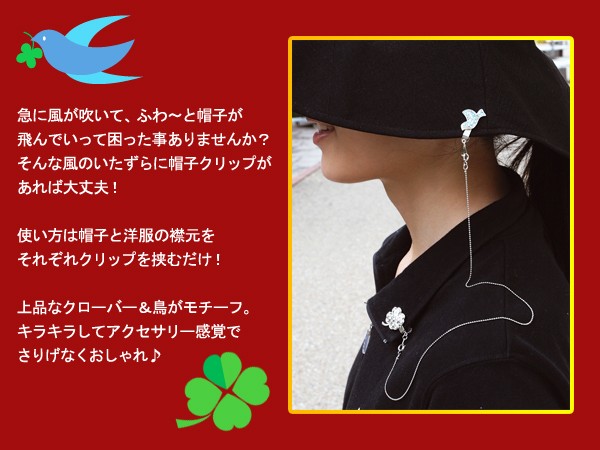 急に風が吹いてふわ~と帽子が飛んでいって困ったことありませんか?そんな風のいたずらにハットクリップがあれば大丈夫!使い方は帽子と洋服の襟元をそれぞれクリップで挟むだけ!ラッキーアイテムのハト&クローバがモチーフ。キラキラしてアクセサリー感覚でさりげなくおしゃれ。チェーンをはずせば、ブローチとしても使用できます。自転車に乗る時、お出掛け時、風の強い日など外出時の便利な必須アイテム。プレゼントにも最適です。