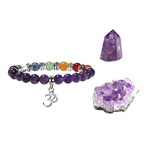 JOVIVI 3pcs Chakra Crystal Healing Kit / 7 Chakras Gemstone & Amethyst Yoga Balancing Beads Stretch OM Bracelet,Amethyst Cluster,Amethyst Point Wand Meditation Set