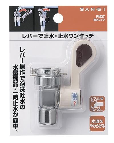 レバー操作で、泡沫吐水の水量調節・一時止水が可能です。丸吐水口径13~22mm用のビス止め式。 製造国:日本 素材・材質:黄銅、ABS樹脂 ※サプライヤー直送品 ご注文後2~3営業日後の出荷となります