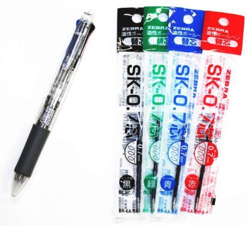 Zebra B4sa1 Clip-on Multi Multifunctional Pen (0.7mm Black, Blue, Red and Green + 0.5mm Mechanical Pencil) - Transparent Barrel & 4colors Ink Pens Refills Value set(with Values Japan Original Discription of Goods)