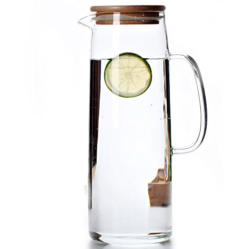 This glass pitcher measuring 25 x 8 x 9.5 cm/ 9.84 x 3.14 x 3.74 inches and holding 50 ounces each, can be used for cold or warm beverages. With A Wooden Filter Lid---