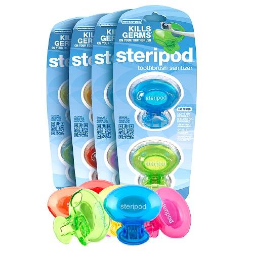 -. Feature : Steripod Toothbrush Sanitizer, Assorted Colors 4 pack / Made in Mexico *Steripod does not protect against disease. *1Oral-B is a registered trademark of the P&G Business Services Company Canada. *2SoniCare is a registered trademark of Philips Oral Healthcare, Inc. *3Crest is a registered trademark of Procter and Gamble Company. *4Colgate is a registered trademark of the Colgate-Palmolive Company. **Actual product styling and colors may vary. Warnings Contains Thymol.