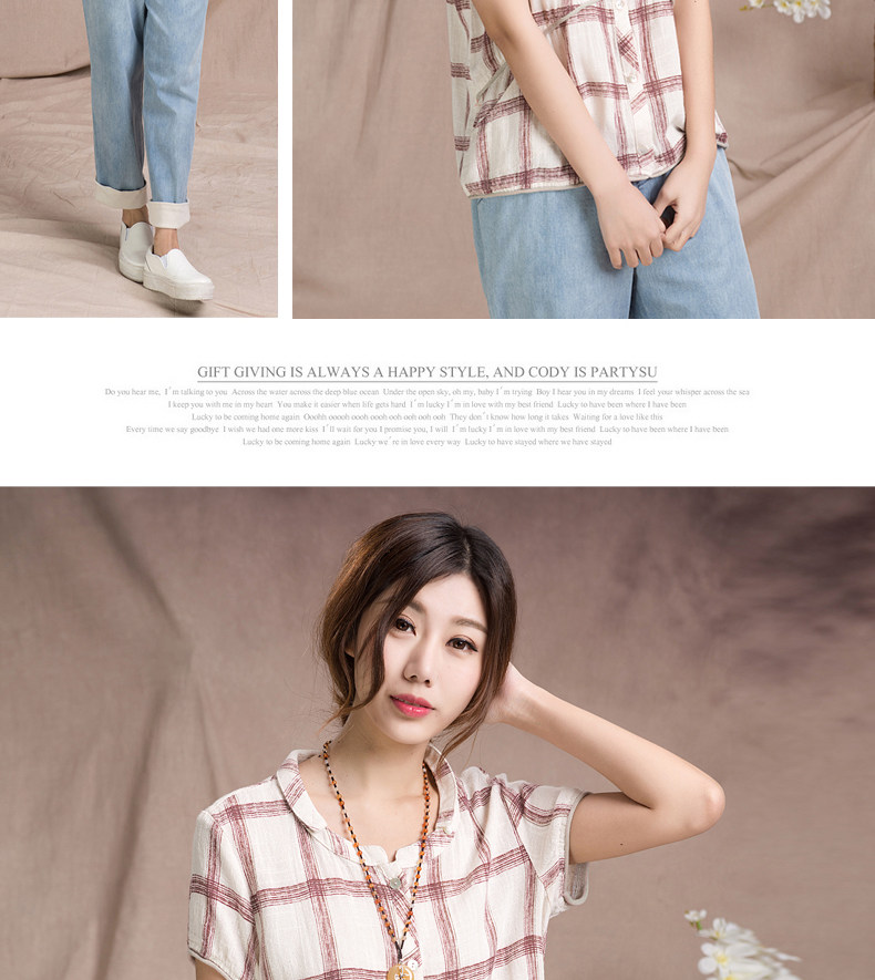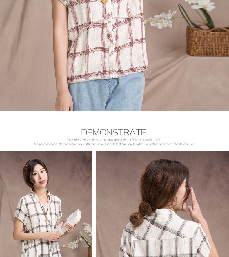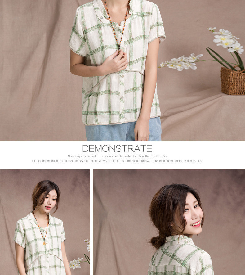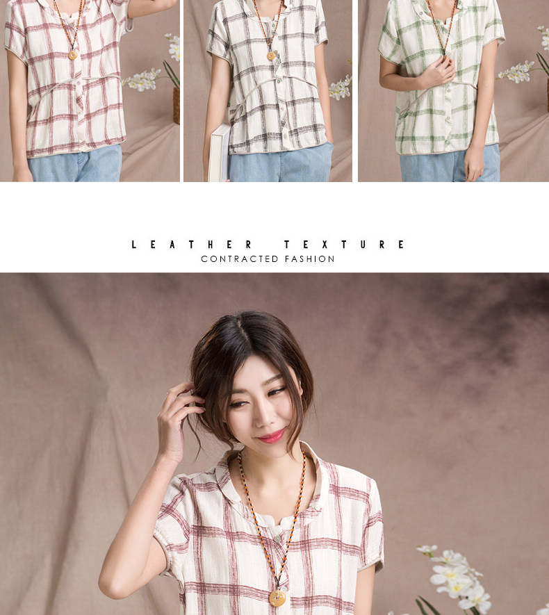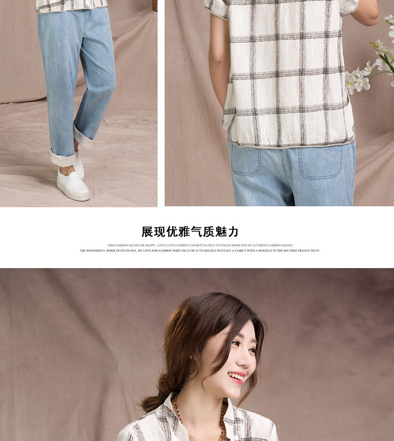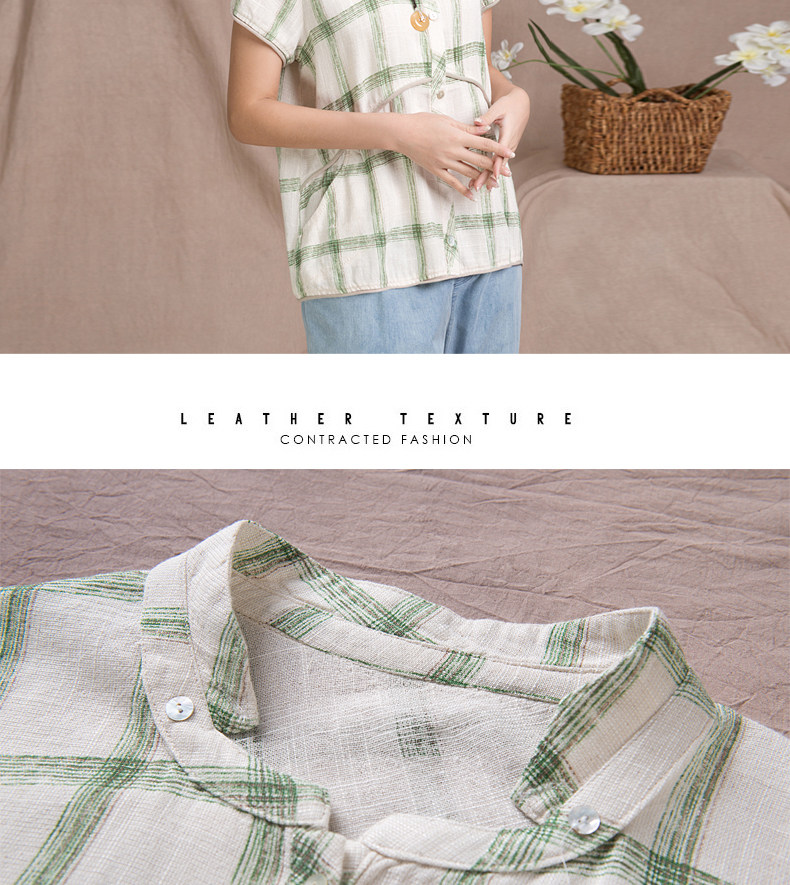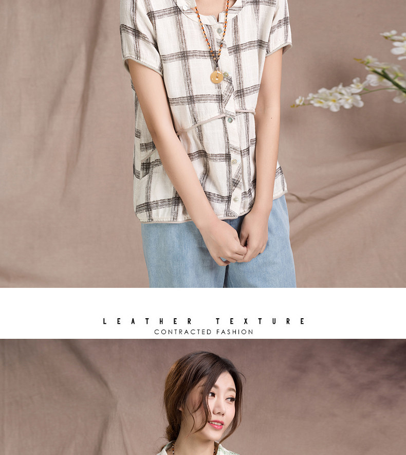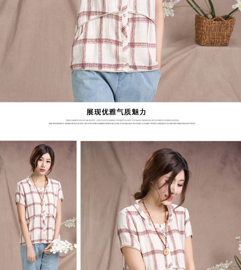 夏装妈妈装短袖棉麻T恤衫新款中老年宽松休闲格子亚麻短袖衫