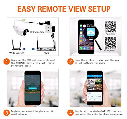 Home security camera surveillance system indoor/outdoor weatherproof cameras Easy DIY installation. Mount the camera ->Plug in power outlet(camera and NVR) ->connect NVR with Network --> Scan QR Code-> Run App-->Add NVR Icloud ID ->View Camera so you can even monitor the exterior of your home