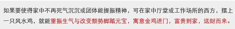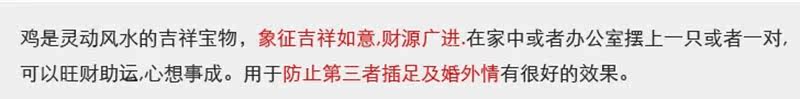 雄鸡,因拥有高耸火红的鸡冠,外观雄壮漂亮,而且,"冠"与"官"谐音,字面的意思是礼。古人以冠冕堂皇为礼,含有升迁腾达的寓意,人们将更多吉祥、腾达的寓意寄托于鸡身上。