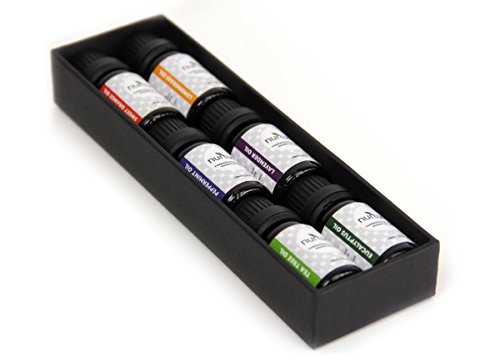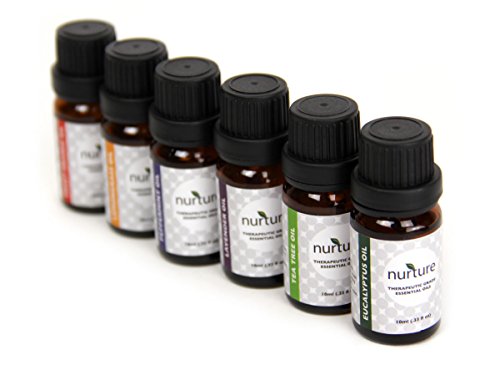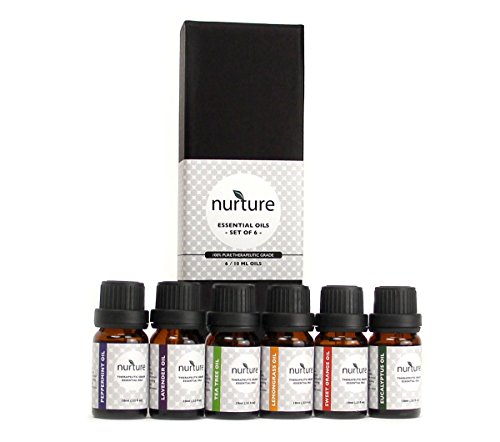 Lavender, tea tree, eucalyptus, lemongrass, sweet orange, peppermint -- six essential oils (100% pure natural organic) in one attractively packaged gift set from Nurture, each designed for a wide range of therapeutic and aromatic needs. The 10ml (.33 fl oz) dark colored bottles have screw-tight lids for no leaks and built-in droppers for precision and economy. Easy to use, these essential oils are designed to work with any diffuser. Fill your home with the all-natural benefits of aromatherapy!