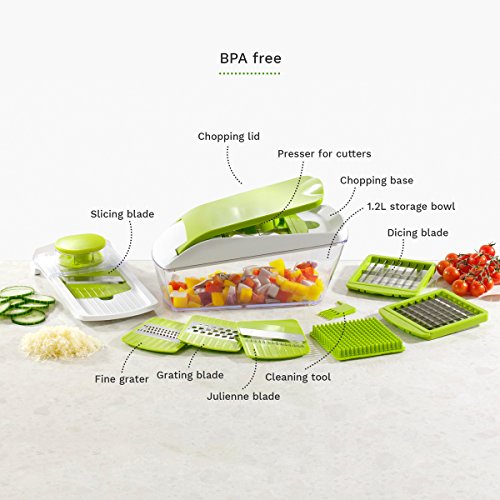 - HIGHLY VERSATILE: Cut into cubes, sticks or wedges. Slice, dice, grate or julienne slice. Great for creating exciting and fun dishes for all of your family and friends. Store and cut straight into the 1.2L bowl, lid provided for your convenience. Save valuable time with this professional kitchen gadget.