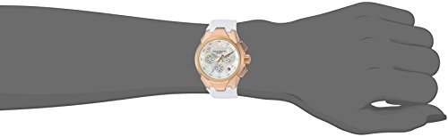 Mother of pearl dial with rose gold luminous hands and rose gold hour markers, chronograph with 24 hr., 60 s and 60 m sub dials, date display, white leather band and push crown
