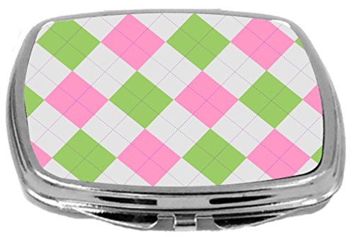 Rikki Knight Compact Mirror, Pink Green Argyle On Grey