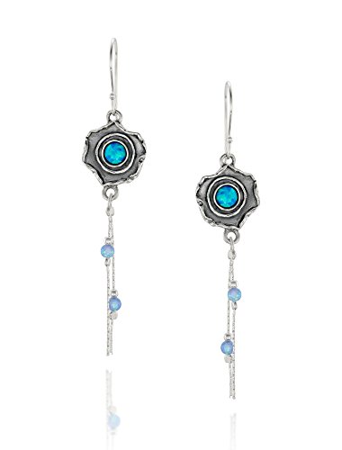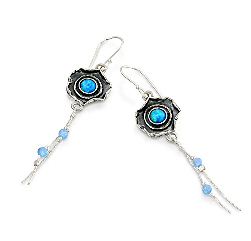 Flower shaped Sterling Silver dangle earrings with created blue fire Opals. 925 Sterling Silver flower earrings with dangling blue fire Opal beads. A 5 mm round cabochon Opal is inlaid in each of these free form flower shaped earrings. The textured oxidized Silver flower has 2 dangling blue fire Opal beads (3 mm each) hanging on two delicate Silver chains. Unique artisan design.