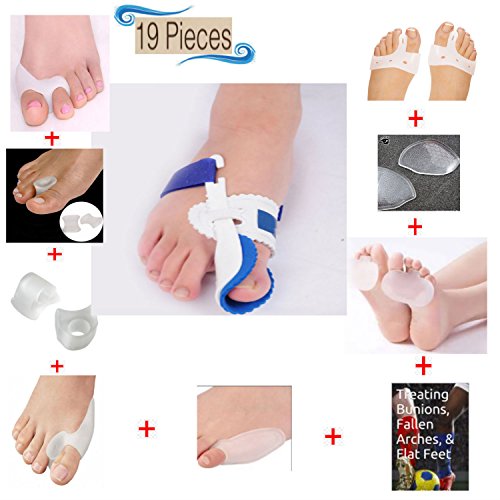 Dr. Kelly’s 19 piece Bunion Treatment Pack FEATURES the Blue Bunion Splint Medical Device designed to take the pressure off the affected joint and help the foot regain its proper shape and alignment. YOU WILL ALSO RECEIVE improved toe spacers, toe separators, bunion straightener, & bunion protectors for ultimate pain relief to help straighten a crooked big toe. Also included are gel inlays for placement under the forefoot to push the metatarsals upward proximal to the pressure-sensitive heads.