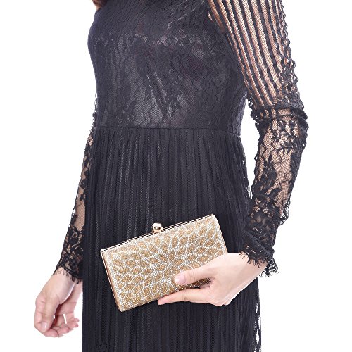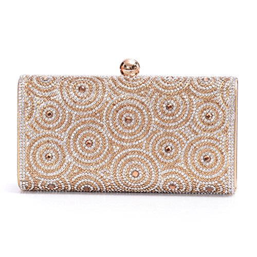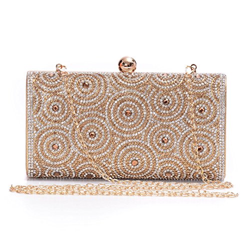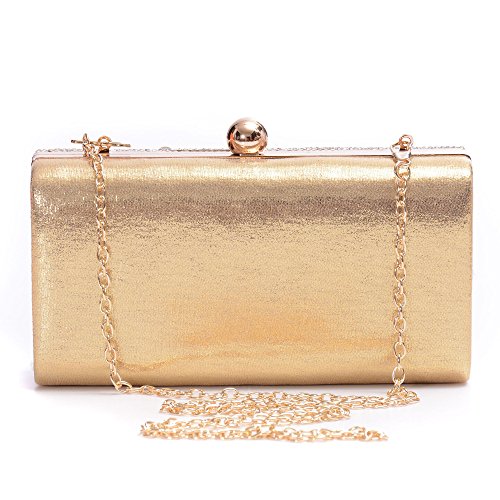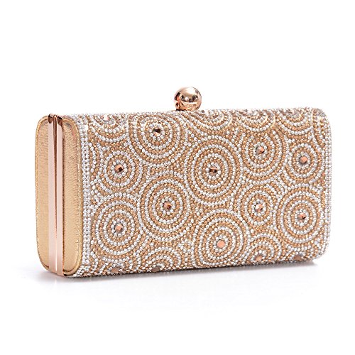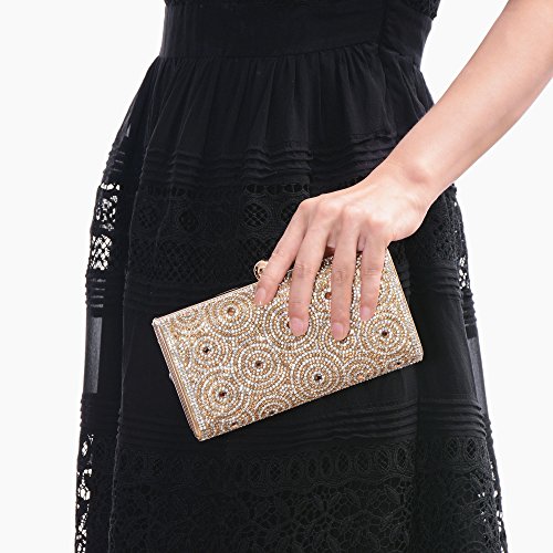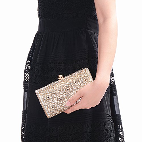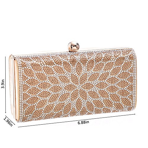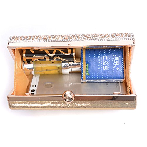 -. Feature : Material: Made of High Quality Genuine Leather / Dimensions: 6.88"L x 1.96"W x 3.9"H,weight is 0.83 pounds,chains length:45.6" / This gorgeous bag is Silver or Gold with hard case and round crystal diamante detail,compact but elegant.Can hold iphone 6s plus,cash,card,keys,mirror and makeups. / Removable long chain for your choice to take it in hand or on the shoulder / Glamorous party handbags avaible 4 stylish and classy colors to match your dress on special occasion