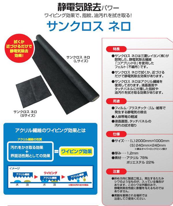 「サンクロス ネロ」は三菱レイヨン(株)が開発した、静電気除去繊維「コアブリッドB」を使用したフェルト(不織布)です。拭くか、近づけるだけで静電気除去に効きます。アクリル繊維を使用しており、液晶画面やタッチパネルに付着した指紋や油汚れを拭き取りに効きます。