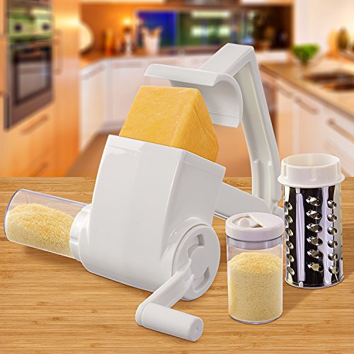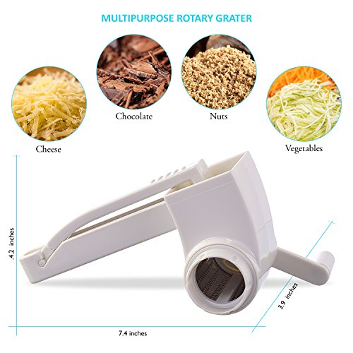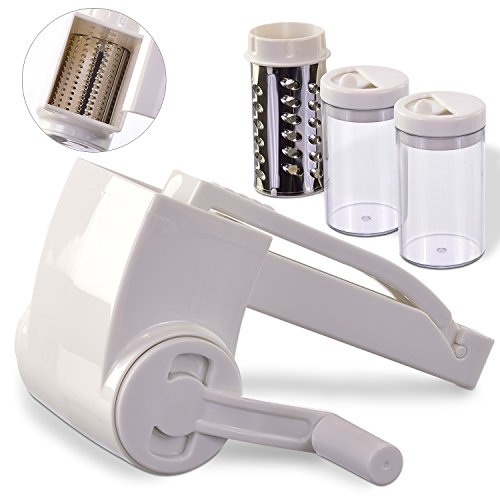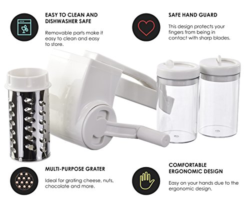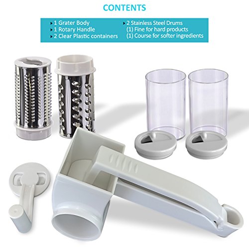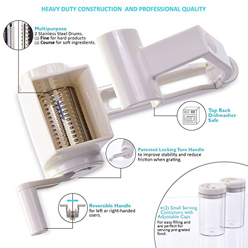 FEATURES YOU WANT! - Patented locking handle improves stability and reduces friction for easier grating. 2 sharpened stainless steel drums - fine for hard cheeses, chocolate and nuts, and coarse for veggies. 2 serving containers with caps - attach to grater, grate directly into containers then serve at the table. Large hopper holds more food. Reverses for left-handed users! Disassemble and toss in the top rack of the dishwasher for easy clean-up.