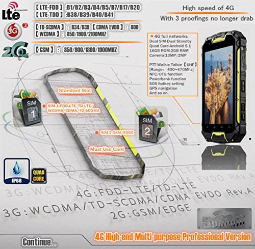 -. Feature : 【4G band】(Apply to major telecom bands of U.S.):【LTE-FDD】:B1/B2/B3/B4/B5/B7/B17/B20;【LTE-TDD】:B38/B39/B40/B41. / 【Function and Configuration】PTT-Walkie Talkie(Support UHF-Frequency range:400~470Mhz)/NFC/OTG/Powerbank/Torch/SOS Hotkey setting/Multiple languages; Camera [13MP(back)+2MP(front)]/Memory[16GB(ROM)+2GB(RAM)]/T-Flash card, Support up to External 32GB SD Card. / 【Materials and Design】Use high strength plastic, anti-shock material, sturdy and surable/Stylish design, out of the ordinary,fine workmanship sophisticated, best Quality. / 【Wide application】In addition to routine use,especially suitable for outdoor operation, industrial use,logistics shipping,security intercom/Tourism exploration,skiing,riding, other sports and so on. / 【Deluxe professional packing boxes】Package Content:Smartphone,Battery(4700mAh),Antenna,USB Cable,Charger,Earphone,Antenna,Keychain with Compass,Opening Tool,User's Manual,Warranty Card;