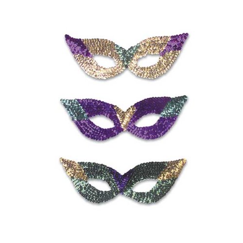 -. Feature : 12 masks per package. / Cat eye mask. / Gold, green and purple sequin designs. / Assorted colors. / 7 1/2 ″ across the face and 2 1/2 ″ tall.
