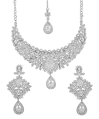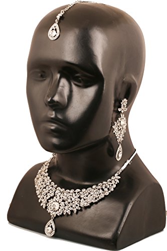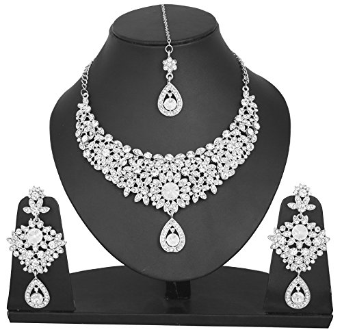 Alloy metal, white tone, very exclusively designed white rhinestones necklace set with identical earrings and mangtika. For Perfect Matching, search for TOUCHSTONE BANGLES.