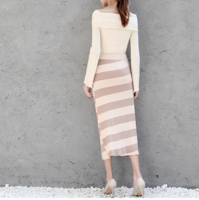 ニットの素材感や、裾に向けてやや広がりの有るシルエットがポイント◎