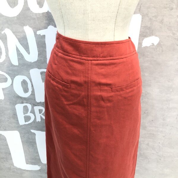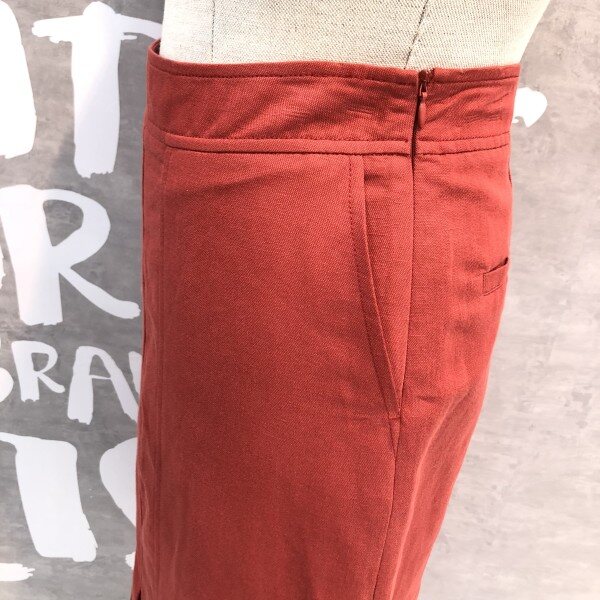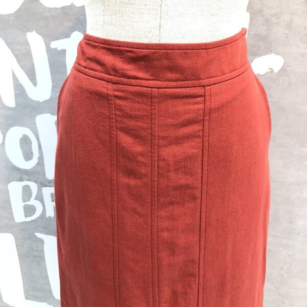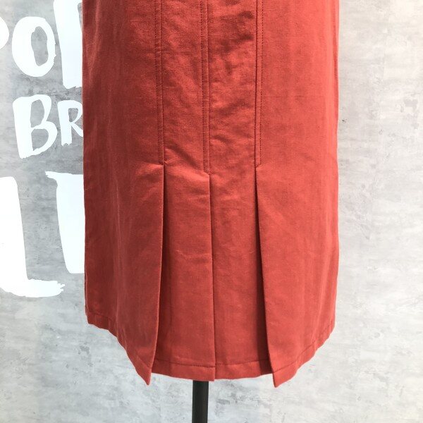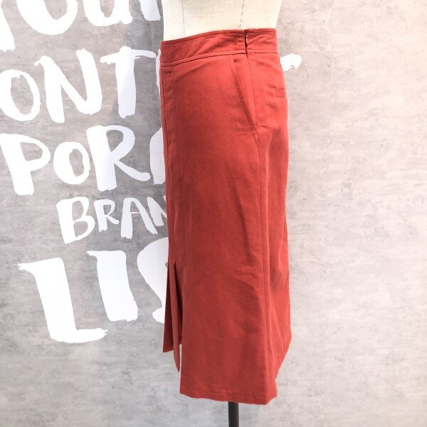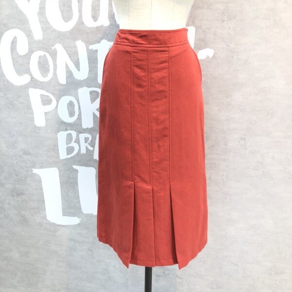 프론트 슬릿 디테일의 플리츠 디자인이 유니크한 솔리드 컬러의 미디 스커트입니다