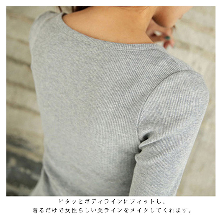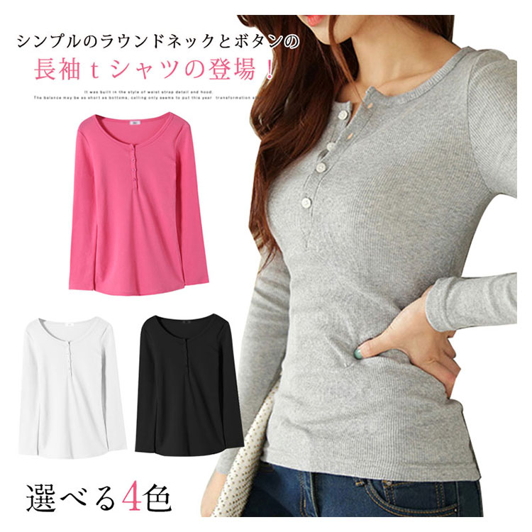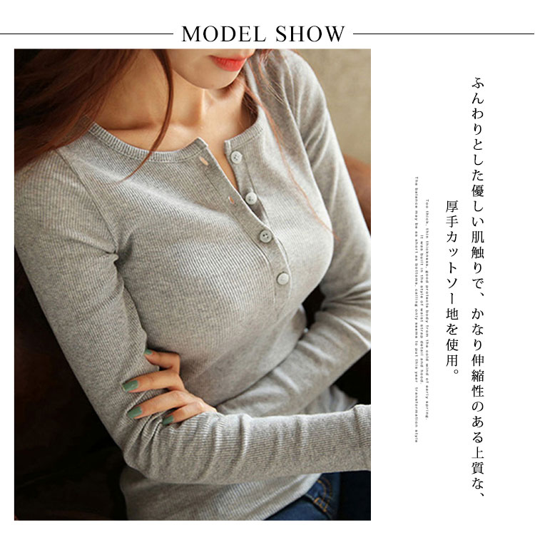 | シンプルのラウンドネックとボタンの長袖tシャツの登場!ふんわりとした優しい肌触りで、かなり伸縮性のある上質な、厚手カットソー地を使用。ピタッとボディラインにフィットし、着るだけで女性らしい美ラインをメイクしてくれます。シンプルだからこそ、使いやすく、メインとしてもインナーとしても使える定番カットソー。 | |