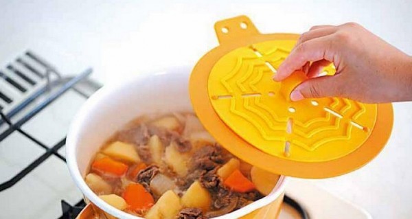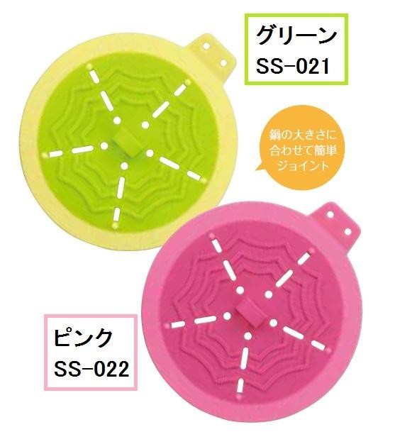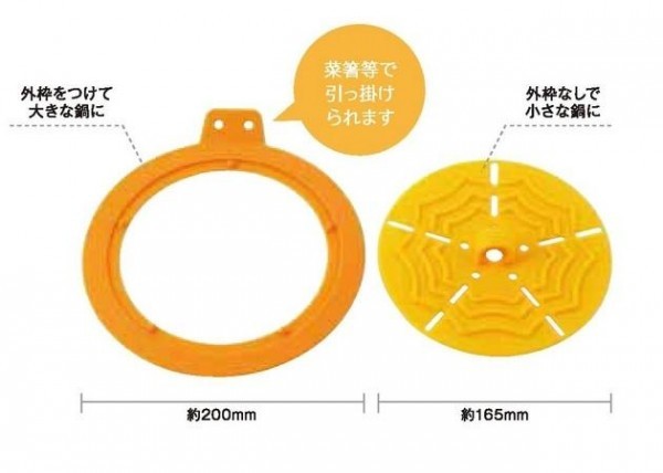 | 18~20cmお鍋は小サイズを、22cm以上のお鍋は大サイズをジョイントして使う便利な2役のシリコン落とし蓋。大の突起部5箇所を小の穴にセットするだけの簡単ジョイント式。(小)は中央のツマミが箸、トング、指で掴みやすいリング型。(大)は外周の2箇所穴に菜箸を入れ取り出しやすい設計。循環したアクが溜まりやすい3本リブが付いています。 |
