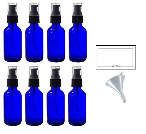 2 oz Cobalt Blue Glass Boston Round Treatment Pump Bottle (8 pack) + Funnel and Labels for essential oils, aromatherapy, food grade, bpa free