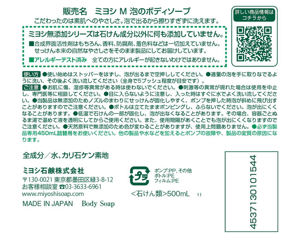 "Miyoshi additive free soap body soap 500 ml (no additive soap)" is a non-additive body shampoo that foams soften friction stimuli to the skin.