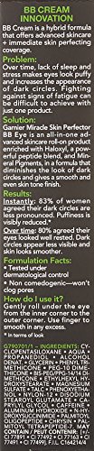 Problem: Over time, lack of sleep and stress makes eyes look puffy and increase the appearance of dark circles. Fighting against signs of fatigue can be difficult to achieve with just one product. Solution: Garnier Skin Renew Miracle Skin Perfector B.B. Eye is infused with Haloxyl to instantly illuminate and visibly correct puffiness and dark circles around the eye. Mineral pigments leave skin with an even-toned complexion. The formula is applied with a cooling roll-on applicator that helps combat signs of fatigue leaving the area around the eye awakened and refreshed. Garnier Skin Renew Miracle Skin Perfector B.B. Eye provides 5 instant results: corrects dark circles, minimizes puffiness, awakens skin, evens skin tone and hydrates all in one simple step. B.B. Cream (Beauty Balm Cream) is a hybrid formula that offers advanced skincare plus immediate skin perfecting coverage, combining several beauty routine steps in one single product. Results: Instantly: 85% Dark Circles are less pronounced. 75% Eye area is less puffy. After 7 Days: Eyes look well-rested, smoother and dark circles appear corrected.Feature