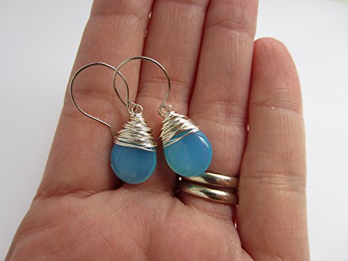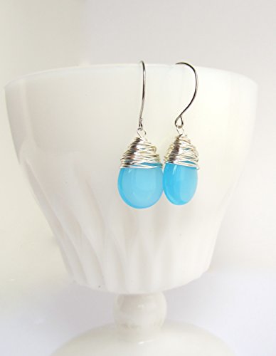 -. Title : Milky Aqua Blue Earrings Wire Wrapped Drops Aqua Czech Glass Earrings Silver Tone