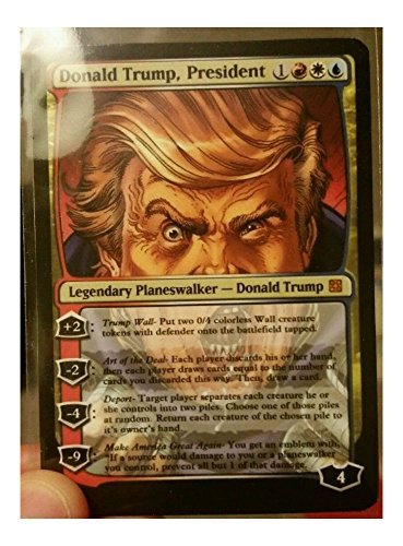 -. Binding : Toy -. Brand : Unbranded -. Color : na -. EAN : 0746264073748 -. Feature : Playable Donald Trump Planeswalker. / Great for an EDH or casual deck. / Build a wall deck! / Fun to play with and sleeve playable! / Comes with the matching emblem. -. IsAdultProduct : 0 -. Label : na -. Manufacturer : na -. ProductGroup : Toy -. ProductTypeName : TOYS_AND_GAMES -. Publisher : na -. Studio : na -. Title : Donald Trump Planeswalker! MTG Card -. UPC : 746264073748