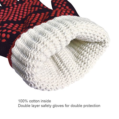 - UNIQUE DESIGN Non-slip Design with silicone dots on both sides will provide Excellent Grip for you.And the inner layer of the grilling glove consists of cotton for absorbing sweat at all times, this will keep your hands clean and comfortable.