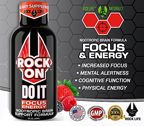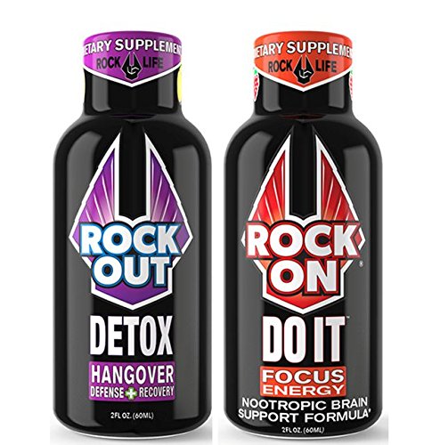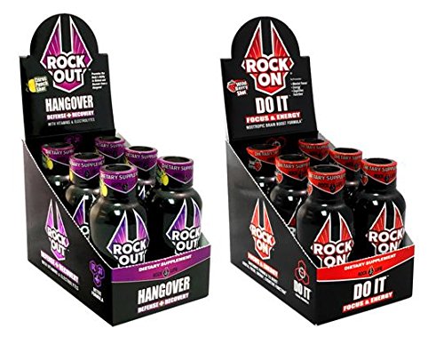 Studio : Rock'N Products, LLC Publisher : Rock'N Products, LLC Binding : Health and Beauty Product Description PARTY SURVIVAL KIT for all those Holiday parties, Tailgating, BBQ's, Happy hour, Vegas trips, Bachelor and Bachelorette parties, and Weekend adventures. ROCK OUT Hangover Defense and Recovery shot can help you enjoy your night and bounce back to take on tomorrow. Whether you have to work the next day or simply just don't want to lose another day of your life lying in bed wishing you felt better. Rock Out to help optimize your body's ability to detoxify alcohol, rehydrate the body, restore essential nutrients and neutralize and defuse toxins. Whether you're young or old you can still make the most of your night and you're your next day. Rock Out, in Citrus Punch flavor, uses natural wellness ingredients, vitamins C, B's, amino-acids and antioxidants to feel better tomorrow. ROCK ON DO IT Focus Energy shot is a Natural Brain Boosting Dietary Supplement Designed to Support Cognitive Function, Focus, Memory Alertness, Mental and Physical Energy. Are you a student who finds it difficult to study, a professional struggling with long, unsociable hours, or a homemaker juggling an impossible number of tasks? It's not the energy your looking for it is the focus that you really need to get your goals done. Why just have a regular energy shot that can increase anxiety and hamper focus if your can have a Nootropic brain supporting energy shot. ROCK ON -DO IT Is designed is formulated with notion of promoting cognitive function and giving you the right amount of energy to help you naturally achieve an active and focused mind in a pleasant shot. DO IT uses Brain Boosting Natural Nootropic, Vitamins and Minerials Including: L-Tyrosine, Ginkgo Biloba (Leaf), Rhodiola Rosea(root), Ginsing Leaf extract, Choline, DMAE, Huperzine A (Club serrata), Alpha Lipoic Acid, Vitamin B6, Vitamin B12, Green Tea extract, L-Theanine, Folate (Folic acid-Vitamin B9), and Caffeine. MADE IN THE USA 0