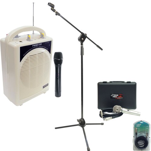 Studio : Pyle Publisher : Pyle Product Description This wireless PA system is perfect for events where you need to move around with your microphone and retain the same quality sound you expect from a wired amp. It comes with a wireless mic that operates at a distance up to 100 feet. The amp is compact and lightweight for easy portability. It runs on a rechargeable battery, so you don't need to keep buying new batteries - simply plug in with the included AC adaptor and charge. Adjust the sound to your liking with the treble and bass controls. This amp even includes an echo knob for a wicked sounding voice effect. There's also a ¼" jack input to plug in a wired mic. The wireless mic required one 9V battery (not included). In addition we have added an additional PDMIK4 Dynamic Microphone with Carry Case that makes your voice sound great on the stage or in the studio. It offers a clear, transparent sound and has a neodymium magnet designed for high output - everything you need for crystal clarity. The durable metal construction means this mic is perfect for everyday use. Includes a 15' XLR to ¼" cable. It all fits in the included rugged carrying case. We have also added the PMKS3 Tripod Microphone Stand W/ Extending Boom and PPFMXLR15 XLR Male to Female Microphone Cable. Product Dimensions: PWMA100 - 6.9"W x 4.3"D x 9.7"H; PMKS3 - L3.5'X W3.5'X H38' 0