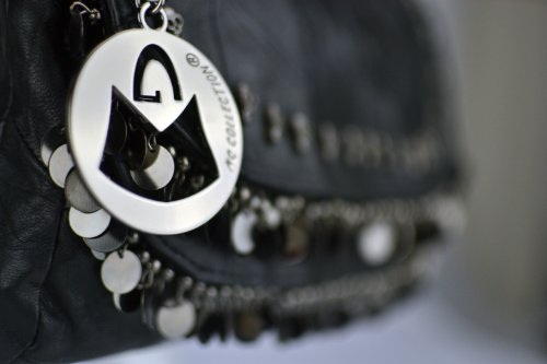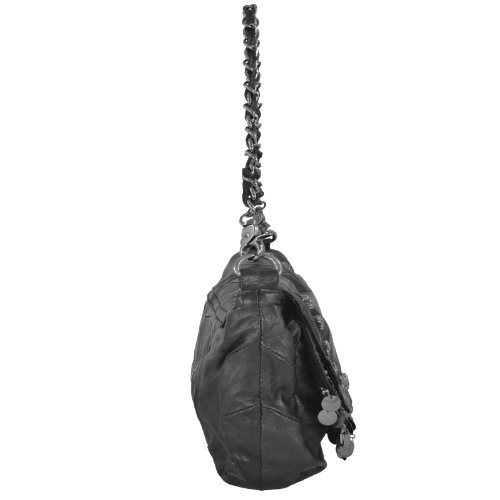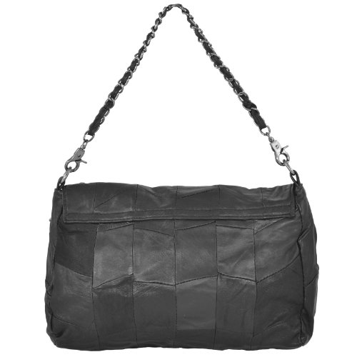 - Feature : A bold and modern black fashion purse adorned with eye-catching sequined fringe and edgy, skull-shaped studs. / The interior of this top handle satchel bag is fabric-lined and outfitted with 2 slip pockets and 1 zippered pockets to help keep smaller items secure and organized. / Use the detachable chain-and-leather handle or the adjustable and removable shoulder strap to keep this women's handbag by your side, or carry this studded purse as a stylish clutch. / **Official MG Collection® product by MyGift® features signature keychain charm** / Genuine leather. Approximate Dimensions: Exterior - 12" W X 7.5" H X 2.5" D; Interior - 12" W X 6" H X 2.5" D; Chain-and-Leather Handle - 8.5" handle drop; Shoulder Strap (fully extended) - 24" shoulder drop.