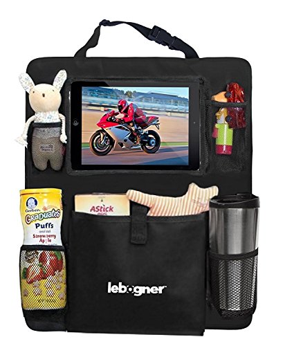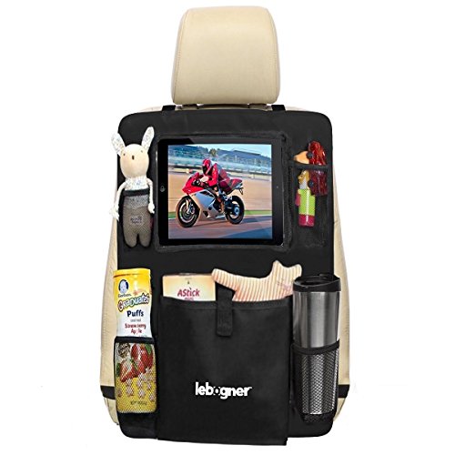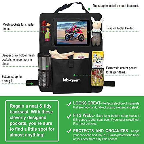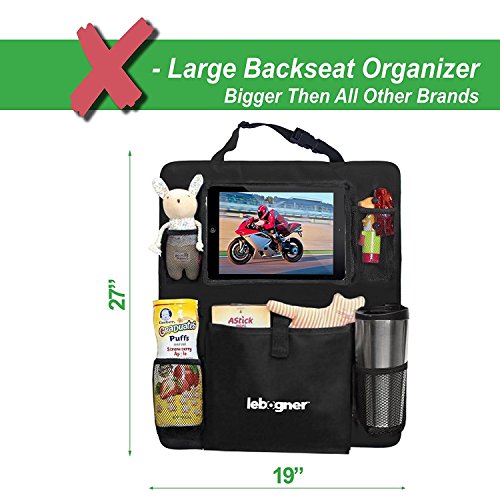 Backseat Organizer + iPad and Tablet Holder By Lebogner, X-Large Multifunctional 5 Pocket Storage Car Seat Back Organizer and Kick Mat Protectors, To...