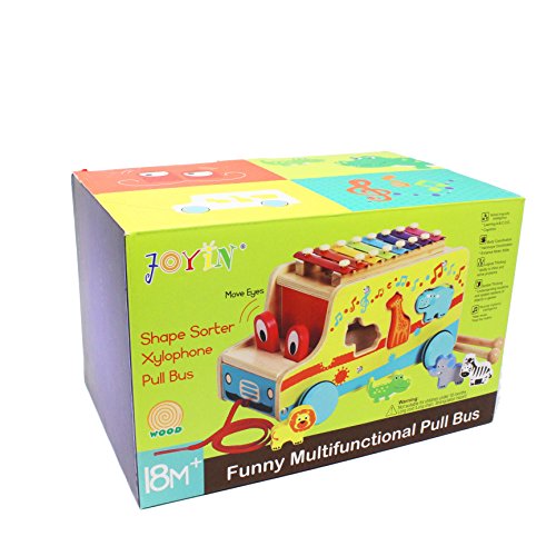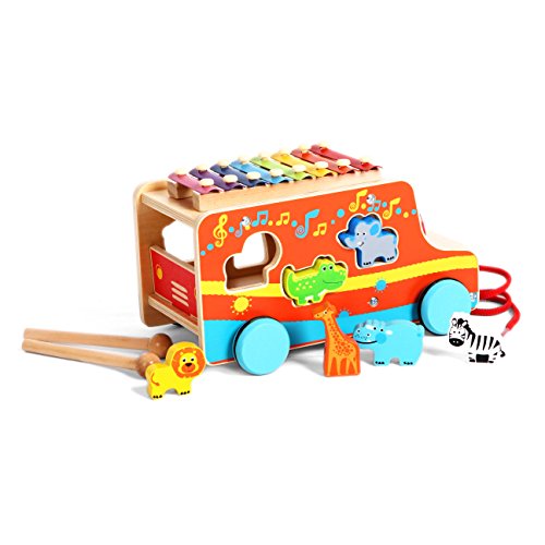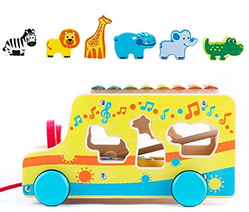 SUPER VALUE- Six Cute Animals in Different Shapes: Zebra, Lion, Giraffe, Rhino, Elephant and Crocodile Sitting on the Wooden Pull Shape Sorting Bus with Xylophone Music Playing Toy.