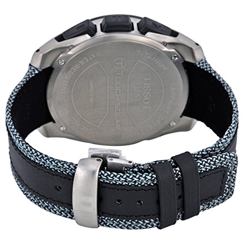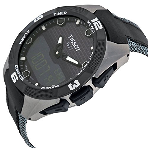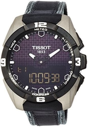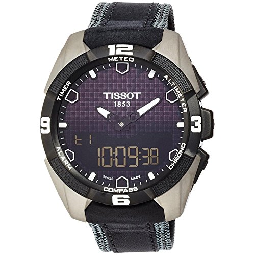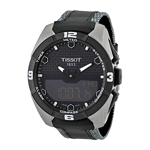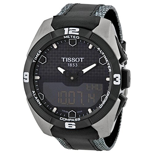 Studio : Tissot Publisher : Tissot Binding : Watch Product Description Stainless steel case with a black leather strap. Fixed black titanium bezel. Black (touch screen) dial with luminous hands and index hour markers. Minute markers around the outer rim. Dial Type: Analog-digital. Luminescent hands and markers. Digital multi-function sub-dial. Solar quartz movement. Scratch resistant sapphire crystal. Pull / push crown. Solid case back. Case diameter: 45 mm. Round case shape. Band width: 22.9 mm. Band length: 9 inches. Butterfly clasp. Water resistant at 100 meters / 330 feet. Functions: date, hour, minute, second. Casual watch style. Tissot T-Touch Expert Solar Black Analog Digital Dial Black Leather Mens Watch T0914204605101. 0