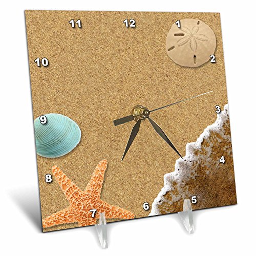 Sandy beach with shells desk clock is a wonderful complement to any room in your home or office. Made of durable high grade aluminum. This frameless clock has a high gloss mirror like, UV coated, scratch resistant finish and is suitable for a moist environment. Measures 6" x 6" and requires one aa battery; not included. Battery box is not covered.Feature