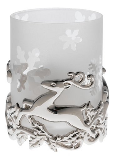 - Silver-plated leaping reindeer base holds the glass votive