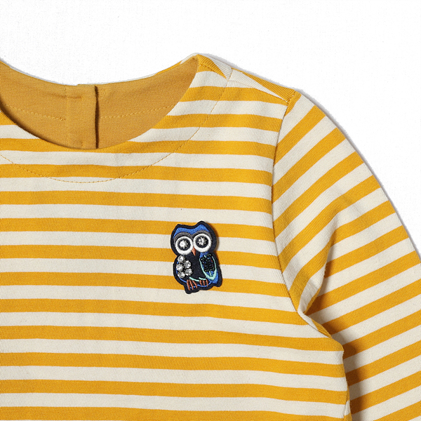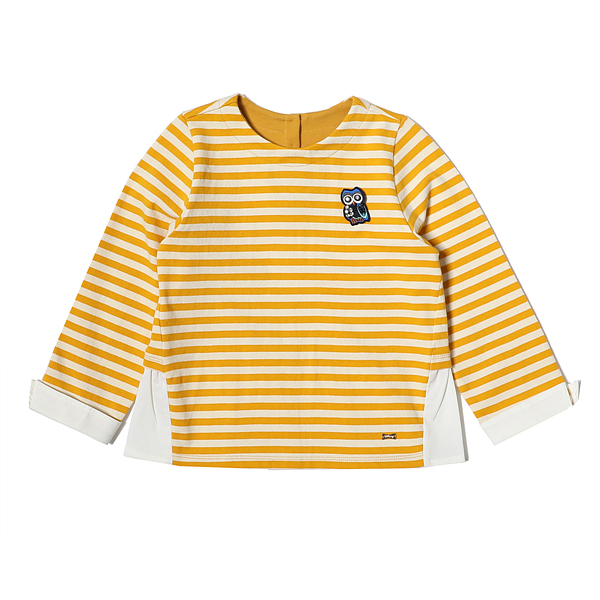 소재-겉감 : 면 100 배색 : 면 65 폴리에스터 30 폴리우레탄 5 색상-옐로우 사이즈-110,120,130,145,155,165상세설명-스트라이프 소재 티셔츠로 뒷판 밑단의 우븐 프릴단과 소매 커프스 장식이 셔츠와 레이어드된 느낌을 주는 티셔츠입니다.