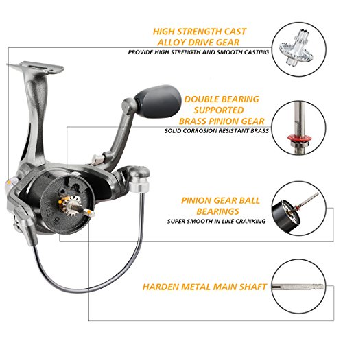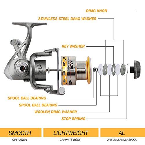 -. Feature : LIGHTWEIGHT DESIGN: The popular narrow graphite frame design and computer balancing system make FISHINGSIR newly launched spinning reel ROCKY an awesome gift for anybody who loves fishing. Easily fits into any fishing box or backpack with you, ROCKY allow you to travel to your favorite spot whenever and wherever you want. / HIGH PERFORMANCE: ROCKY spinning reel with 5.2:1 Gear Ratio, 7+1 Ball Bearings, CNC machine cut metal right/left inter-changeable and collapsible handle. It has a hardened metal main shaft, alloy drive gear, which provides high strength and smooth cast. Super drag system offers great stopping power, less fatigue with high fish fighting power! / SMOOTH PERFORMANCE: FISHINGSIR ROCKY's five quality corrosion resistant ball bearings and one instant stop one-way, anti-reverse roller bearing give it ultra-smooth casting performance. ROCKY will bring you the deluxe fishing experience at affordable P.R.Ice. / VARIOUS SIZES SELECTION: FISHINGSIR ROCKY offers various sizes for FRESHWATER BASS TROUT FISHING, SALTWATER FISHING (Recommended 6000 size and above), INSHORE FISHING, BOAT FISHING or CARP FISHING. Perfect for BASS, TROUT, SALMON, PIKE, CATFISH, CARP. Suitable for lake, river, pond, reservoir, stream or even ocean. / 100% SATISFACTORY GUARANTEE: Brilliant finish and two colors anodized aluminum spool, perfect Thanksgiving, Birthday Christmas Gift for fisherman! We loved our buyers; if you do not satisfied with your buy from us, we will issue a refund without any questions.